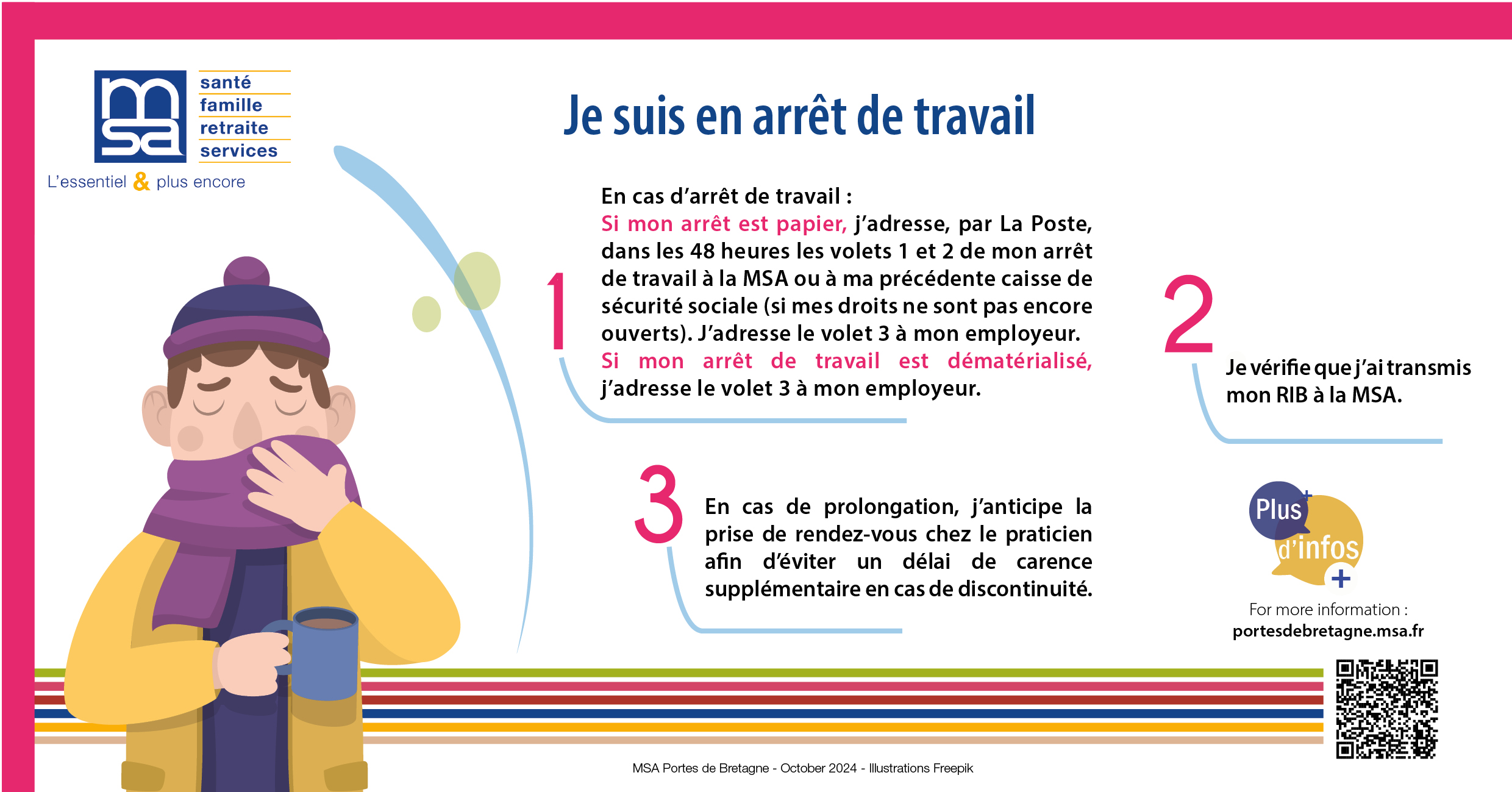 Les moments clés à la MSA Mis à jour le 31/03/2026 Partager : Partager sur Facebook Partager sur Twitter Démarches Documents Arrêt de travail -FR Arrêt de travail-On sick leave_EN Arrêt de travail-concediu medical_ROUM Arrêt de travail-baja_ES Pour visualiser ou imprimer des documents au format PDF : Télécharger Adobe Reader